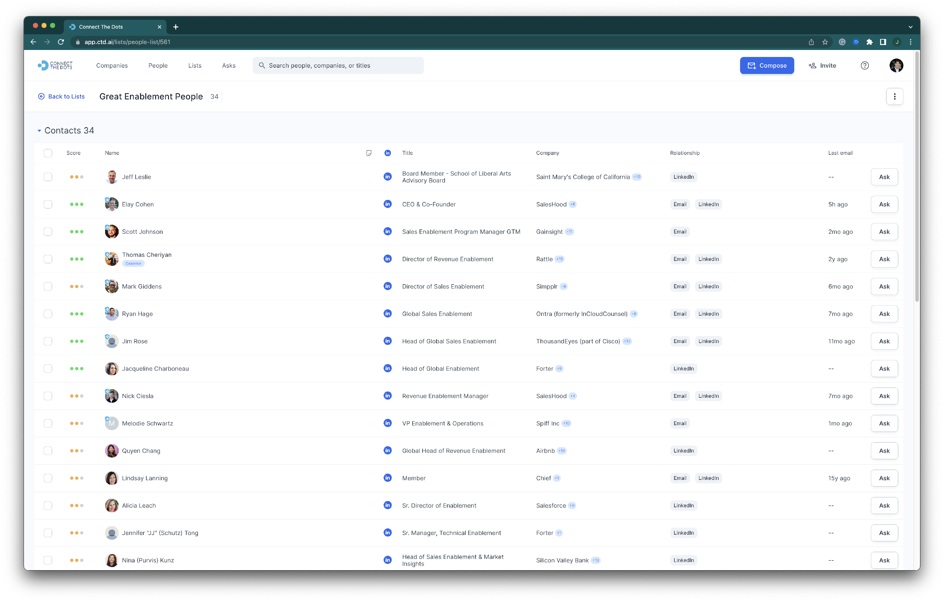 This is a simple list of people. You can add people one-by-one, or you can look at an existing list and multi-select items and add-to-list. Here are some examples of where a list like this might be valuable.
