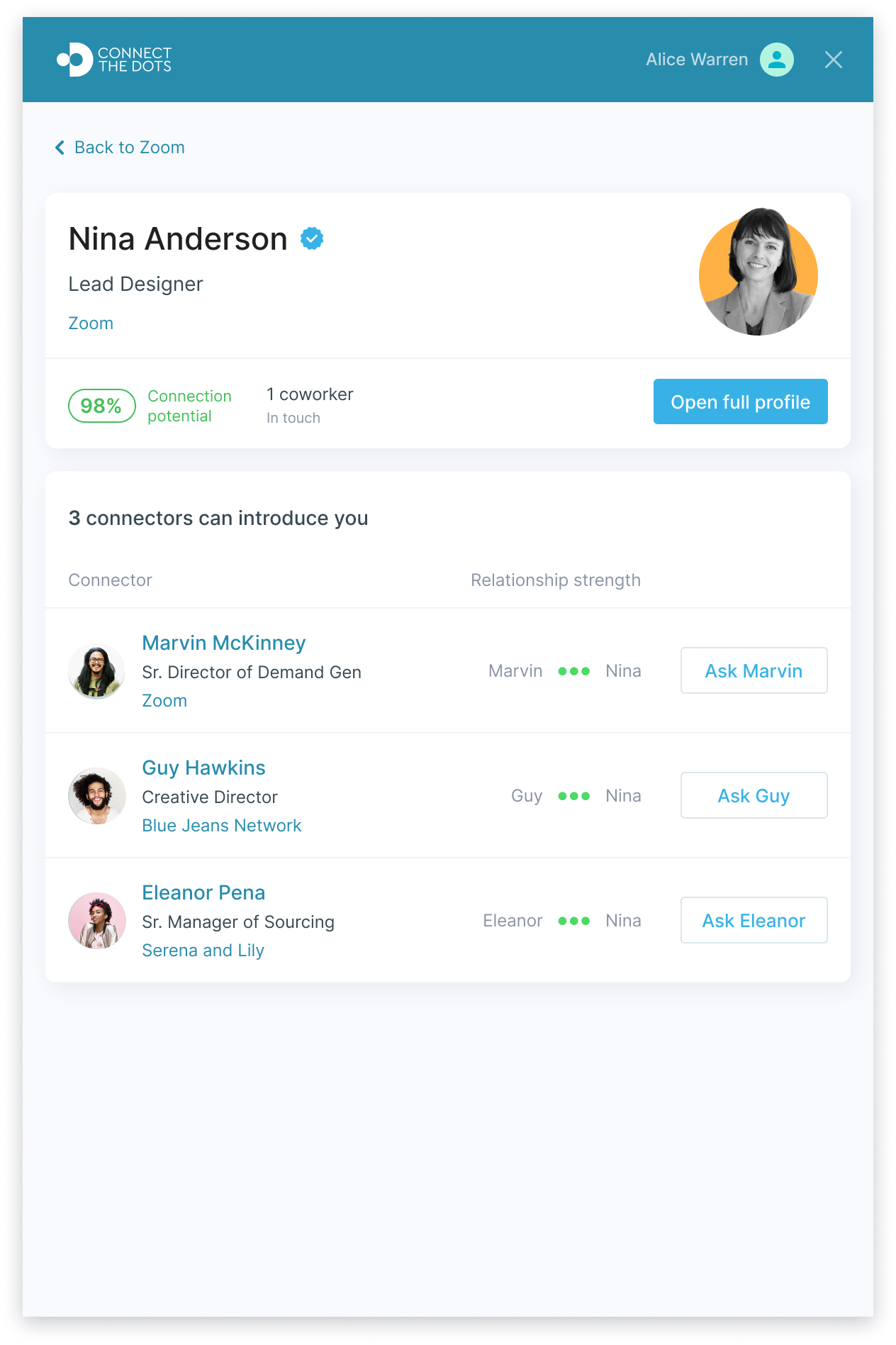 In the example below, imagine you were looking for a contact at Zoom. Nina came up as someone who you might be able to get in touch with through your network. In the image below you can see that three people that have a strong relationship with Nina and can introduce you. As the user, you can decide who you ask based on your personal knowledge of each person.