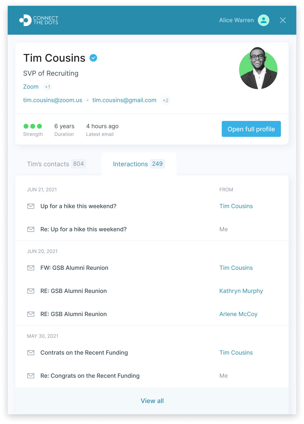 For people you've interacted with directly, you can see all the information that already exists in your email inbox. We present your contact's name, title, company, email addresses, a history of your interactions, and mutual contacts. Mutual contacts are people you've both been on email threads with. If Tim joined Connect The Dots you would also be able to see his contacts. And, of course, handily sorted by relationship strength. The information you'd see for Tim's contacts would be similar to what you see up above.